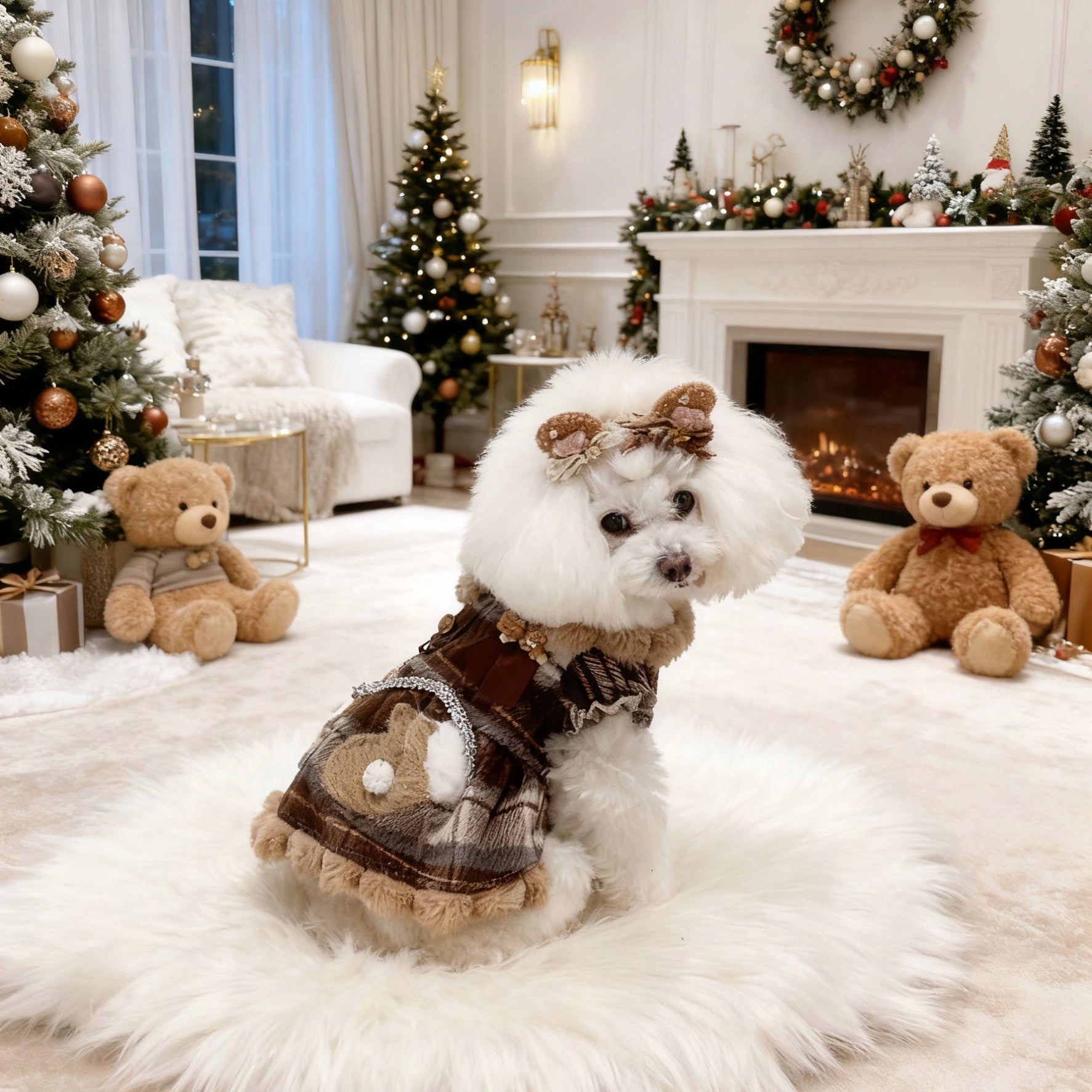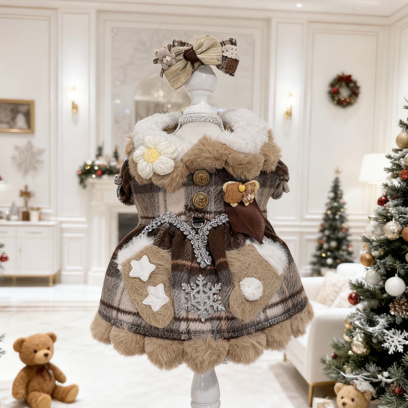 整體裙身布料並不會太厚實臃腫,特意增加毛邊領、雪花裝飾、小熊別針……等細節設計讓冬日氛圍更強烈。